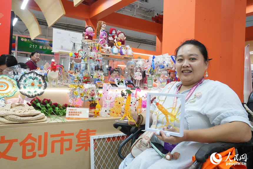 A woman showcases handicrafts she made at the ongoing 24th China Changchun International Agriculture and Food Expo (Trade) in Changchun, northeast China's Jilin Province. (People's Daily Online/Li Yang)