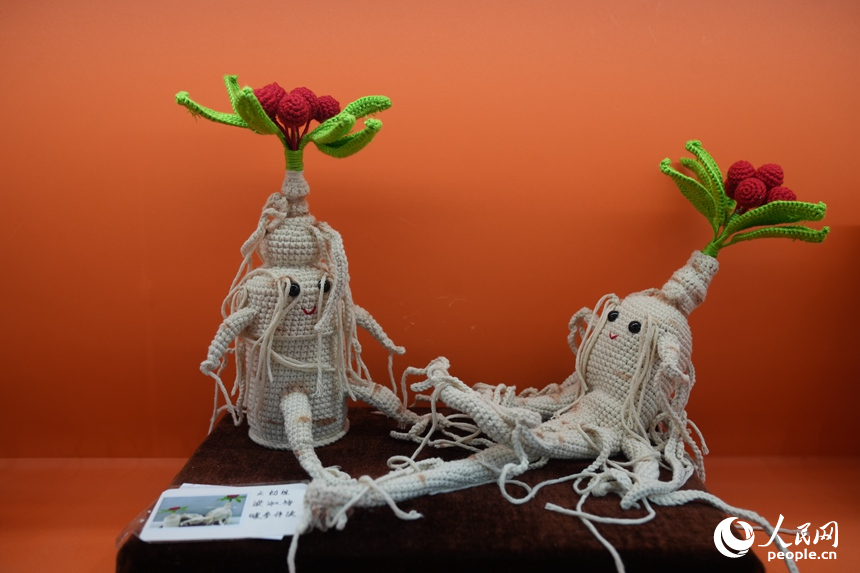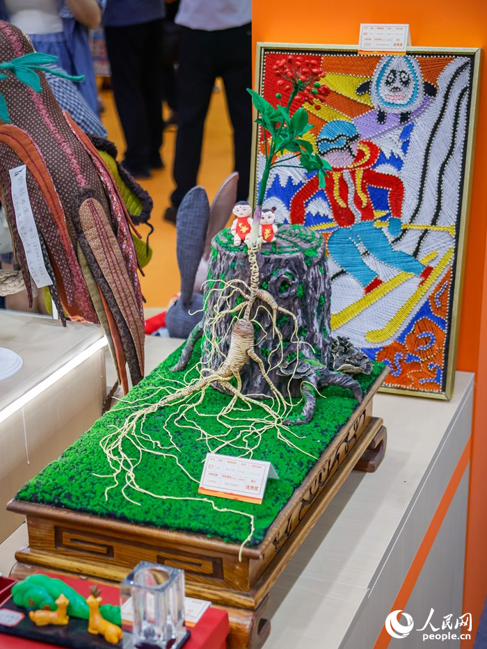 Photo shows exquisite handicrafts inspired by ginseng at the ongoing 24th China Changchun International Agriculture and Food Expo (Trade) in Changchun, northeast China's Jilin Province. (People's Daily Online/Li Yang)
