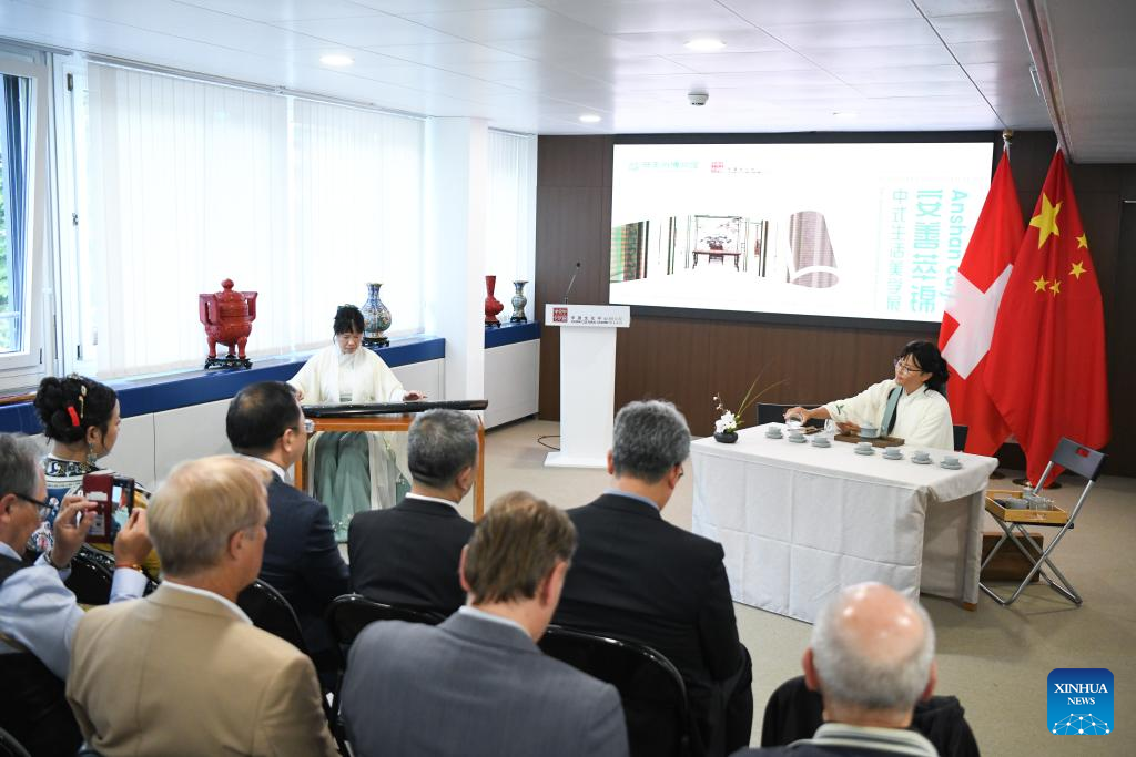 A Chinese Guqin performance and a traditional Chinese tea ceremony are staged during the exhibition "Anshan Cuijin - an Exhibition of Chinese Life Aesthetics" at the China Cultural Center in Bern, Switzerland, Aug. 22, 2025. An exhibition titled "Anshan Cuijin - an Exhibition of Chinese Life Aesthetics" kicked off Friday evening at the China Cultural Center here, attracting local and international guests to experience traditional Chinese culture infused with modern design. (Xinhua/Lian Yi)