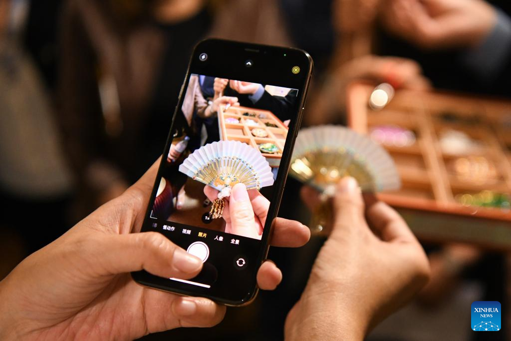 A participant takes a photo of a delicate accessory during the exhibition "Anshan Cuijin - an Exhibition of Chinese Life Aesthetics" at the China Cultural Center in Bern, Switzerland, Aug. 22, 2025. An exhibition titled "Anshan Cuijin - an Exhibition of Chinese Life Aesthetics" kicked off Friday evening at the China Cultural Center here, attracting local and international guests to experience traditional Chinese culture infused with modern design. (Xinhua/Lian Yi)