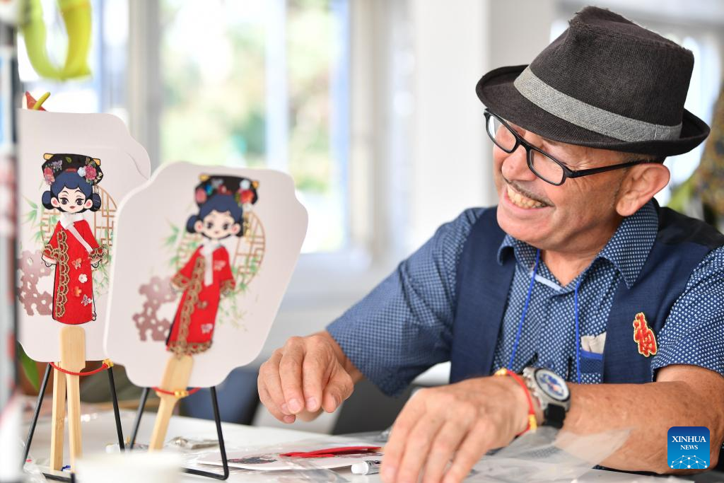 A participant makes Chinese fans during the exhibition "Anshan Cuijin - an Exhibition of Chinese Life Aesthetics" at the China Cultural Center in Bern, Switzerland, Aug. 22, 2025. An exhibition titled "Anshan Cuijin - an Exhibition of Chinese Life Aesthetics" kicked off Friday evening at the China Cultural Center here, attracting local and international guests to experience traditional Chinese culture infused with modern design. (Xinhua/Lian Yi)