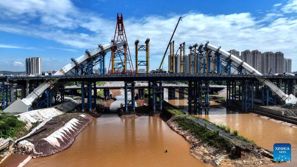 An aerial drone photo taken on Aug. 24, 2025 shows the construction site of Zicai bridge over the Pinglu Canal in Qinzhou, south China's Guangxi Zhuang Autonomous Region. At present, the construction of Pinglu Canal is in full swing. The builders have overcome the unfavorable factors caused by high temperature, typhoon and heavy rainfall to ensure that the construction is advanced as scheduled.