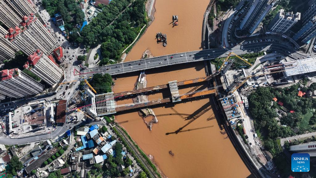 An aerial drone photo taken on Aug. 24, 2025 shows workers at the construction site of Zicai bridge over the Pinglu Canal in Qinzhou, south China's Guangxi Zhuang Autonomous Region. At present, the construction of Pinglu Canal is in full swing. The builders have overcome the unfavorable factors caused by high temperature, typhoon and heavy rainfall to ensure that the construction is advanced as scheduled.