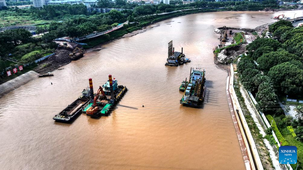 An aerial drone photo taken on Aug. 24, 2025 shows construction team dredging the waterway of Pinglu Canal in Qinzhou, south China's Guangxi Zhuang Autonomous Region. At present, the construction of Pinglu Canal is in full swing. The builders have overcome the unfavorable factors caused by high temperature, typhoon and heavy rainfall to ensure that the construction is advanced as scheduled.