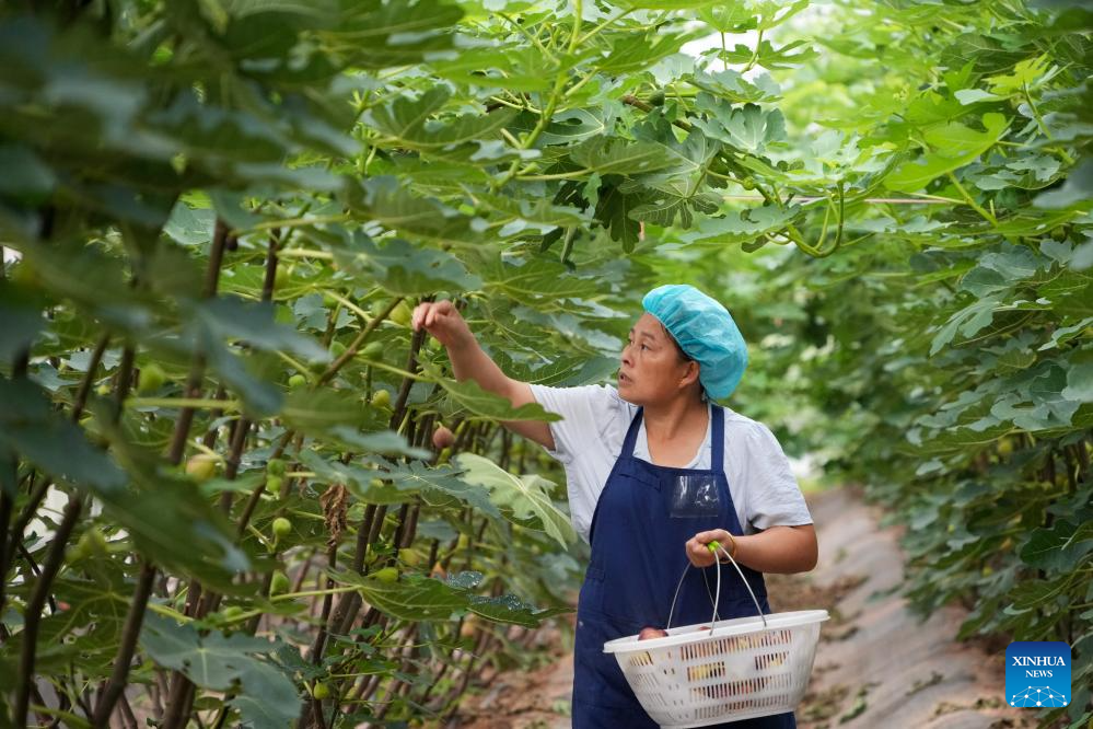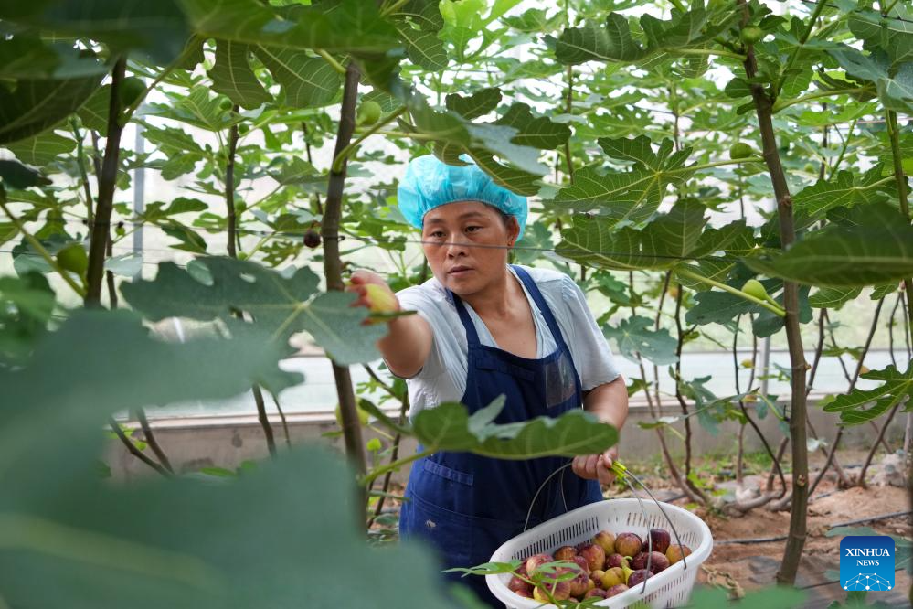 A farmer picks figs in Xintai City of east China's Shandong Province, Aug. 24, 2025. Figs in Xintai City have entered harvest season recently. (Xinhua/Xu Suhui)