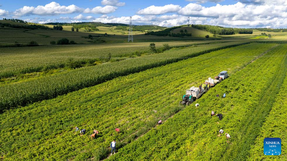 Villagers pick golden berries at a field in Morin Dawa Daur Autonomous Banner of Hulun Buir, north China's Inner Mongolia Autonomous Region, on Aug. 24, 2025. Early autumn sees golden berries, also known as ground berries, entering the harvest season in Morin Dawa Daur Autonomous Banner, Hulun Buir City.