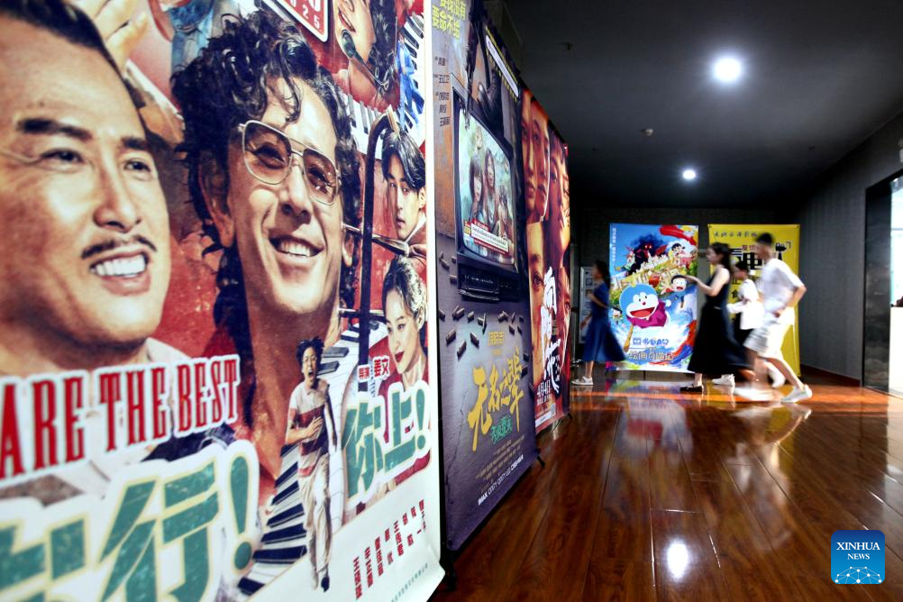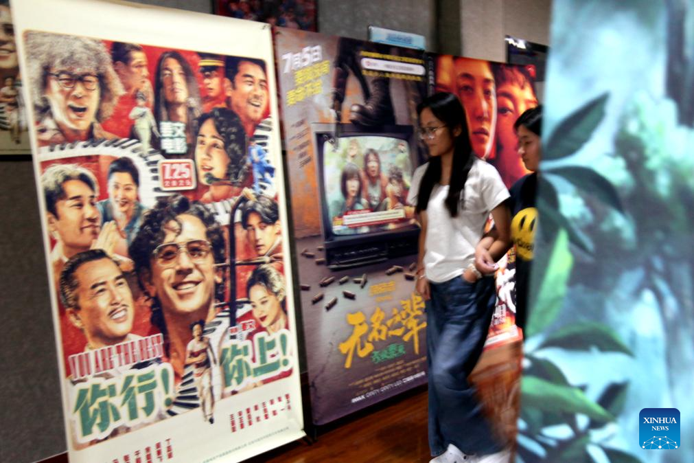 Spectators walk past movie posters at a cinema in Linyi, east China's Shandong Province, Aug. 18, 2025. China's summer box office revenue has surpassed 11 billion yuan (about 1.5 billion U.S. dollars) as of Sunday, with homegrown titles dominating the season's top earners. (Photo by Wu Jiquan/Xinhua)