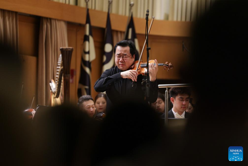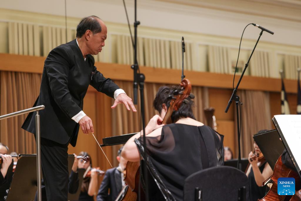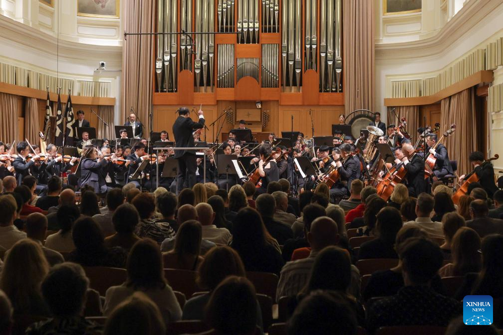 Members of Guiyang Symphony Orchestra from southwest China perform in duration of its European tour, in Ljubljana, Slovenia, Aug. 25, 2025. (Photo by Zeljko Stevanic/Xinhua)
