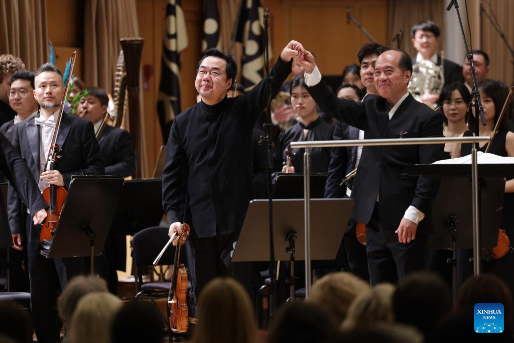 Members of Guiyang Symphony Orchestra from southwest China greet the audience in duration of its European tour, in Ljubljana, Slovenia, Aug. 25, 2025. (Photo by Zeljko Stevanic/Xinhua)