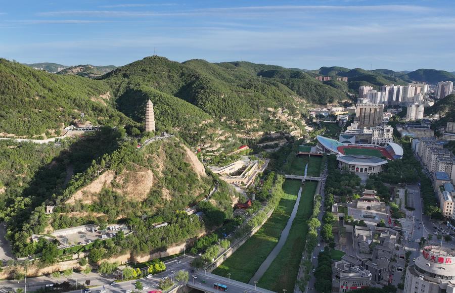 An aerial drone photo shows a cityscape of Yan'an, northwest China's Shaanxi Province, June 3, 2025. (Xinhua/Zhang Bowen)