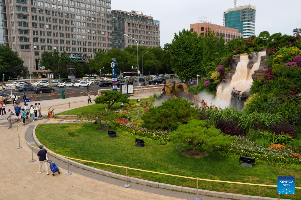 A set of floral installation is pictured at Xidan area in Beijing, capital of China, Aug. 26, 2025. Ten sets of floral installations along Chang'an Avenue marking the 80th anniversary of the victory in the Chinese People's War of Resistance Against Japanese Aggression and the World Anti-Fascist War have been completed. (Xinhua/Ju Huanzong)