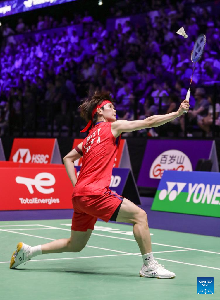 Wang Zhiyi of China hits a return during the women's singles first round match against Agnes Korosi of Hungary at the BWF World Championships 2025 in Paris, France, Aug. 26, 2025. (Xinhua/Zhang Fan)