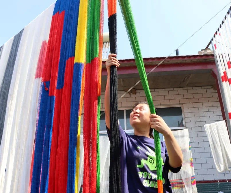 At 6 a.m., Hedonglijiacun village in Dagao town, Zhanhua district, Binzhou city, east China's Shandong Province is already buzzing with activity: colorful fishing nets hanging in courtyards like vibrant canvases, delivery trucks weaving through the alleys, net-weaving machines humming, and salespeople live-streaming to sell fishing nets.