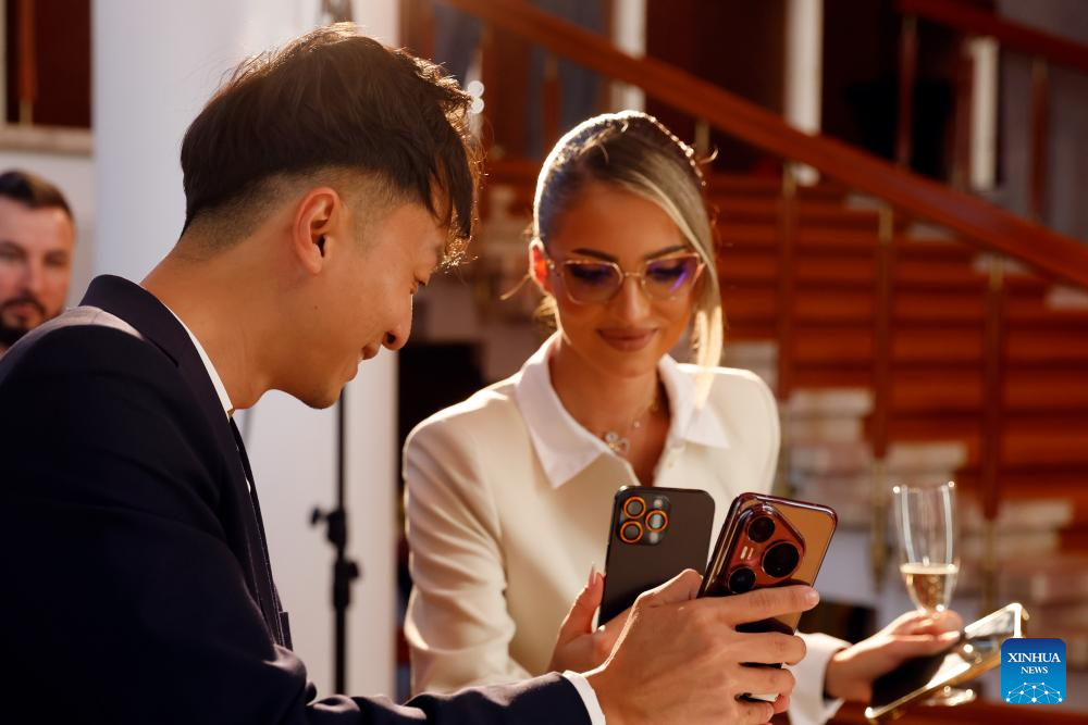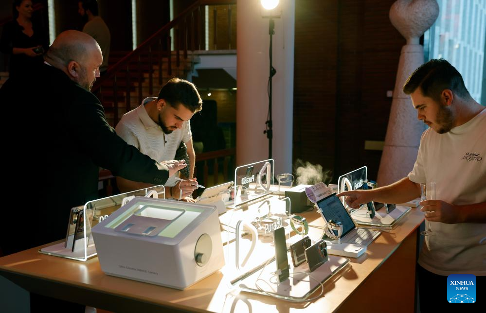 Guests test Huawei Pura 80 series smartphones during a launching event in Bucharest, Romania, Aug. 26, 2025. Huawei launched its Pura 80 series smartphones and tablet product here on Tuesday. (Photo by Cristian Cristel/Xinhua)