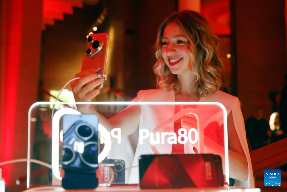 A guest tests a Huawei Pura 80 series smartphone during a launching event in Bucharest, Romania, Aug. 26, 2025. Huawei launched its Pura 80 series smartphones and tablet product here on Tuesday. (Photo by Cristian Cristel/Xinhua)