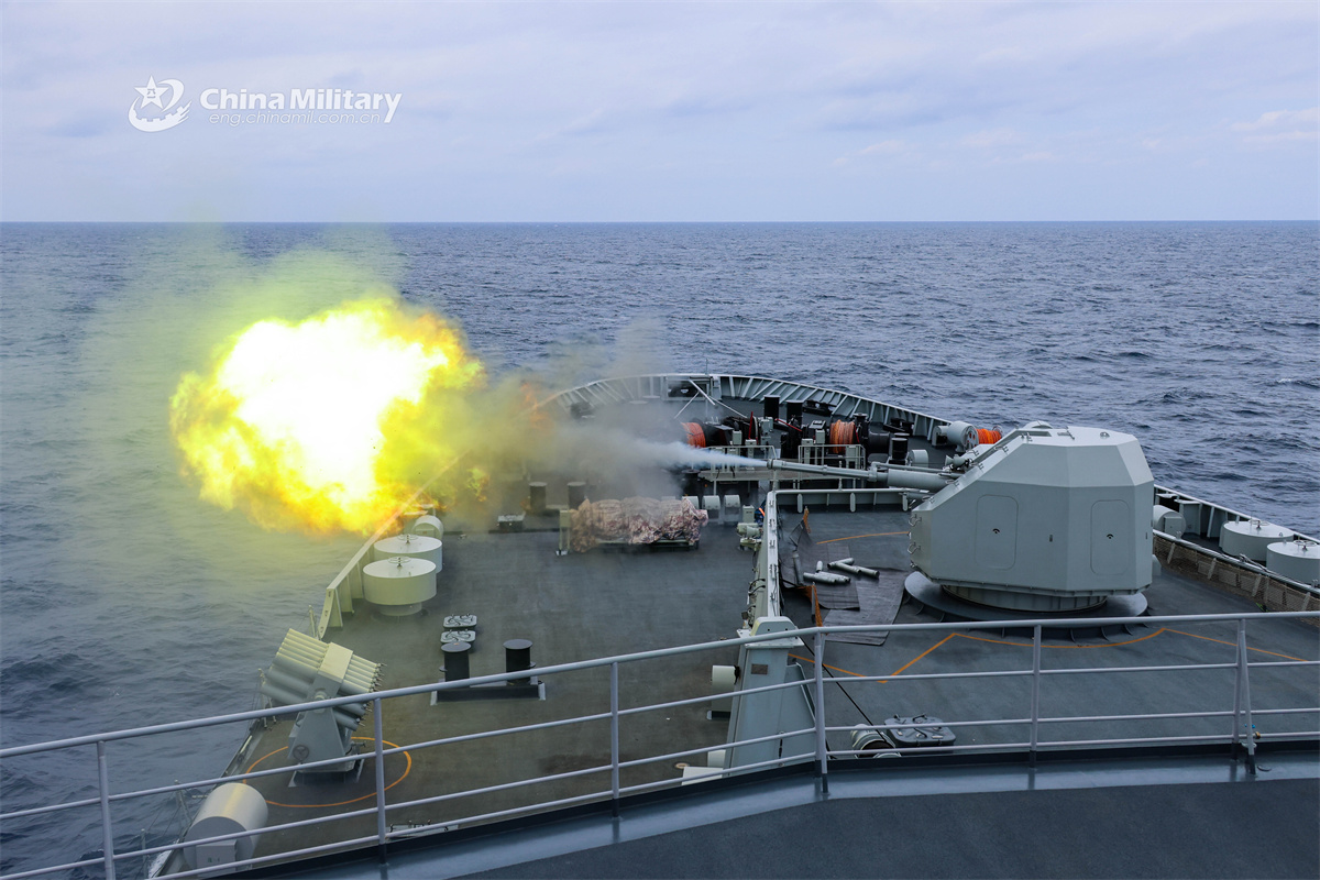 The amphibious dock landing ship Jinggangshan (Hull 999) attached to a naval landing ship flotilla under the Chinese PLA Southern Theater Command fires its main gun at sea targets during a maritime training exercise in the South China Sea in Mid-August, 2025. (eng.chinamil.com.cn/Photo by Qiao Chenxi)