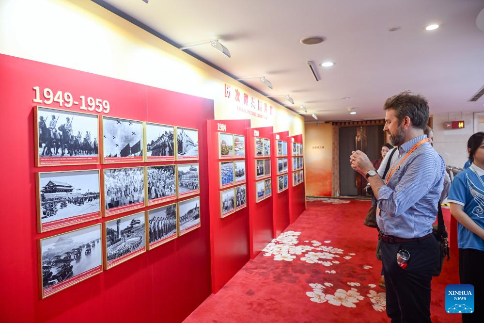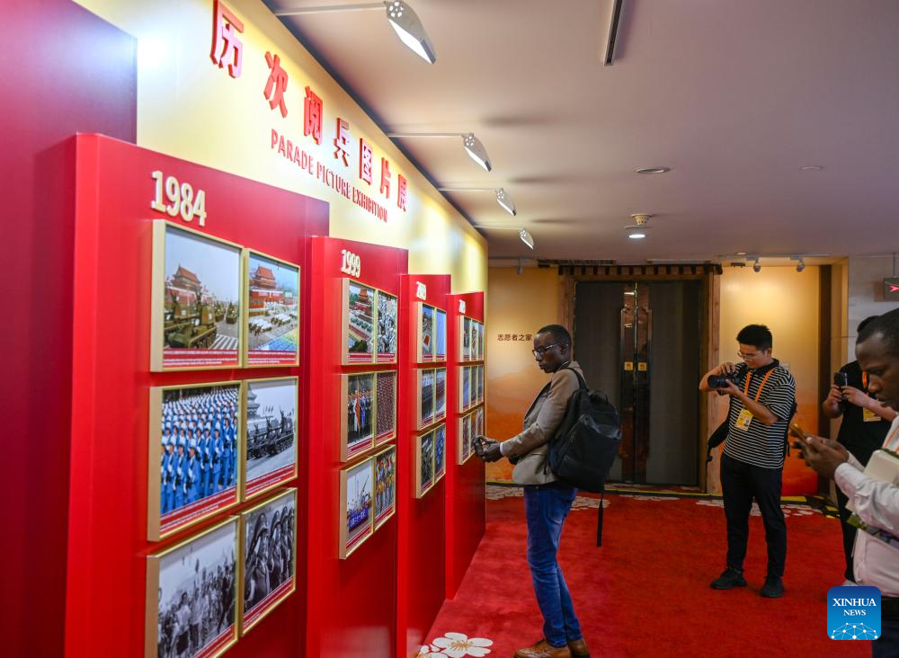 Journalists watch a parade picture exhibition at the press center of Commemoration of 80th Anniversary of Victory of Chinese People's Resistance against Japanese Aggression and World Anti-Fascist War in Beijing, capital of China, Aug. 28, 2025. The press center has opened here on Wednesday.