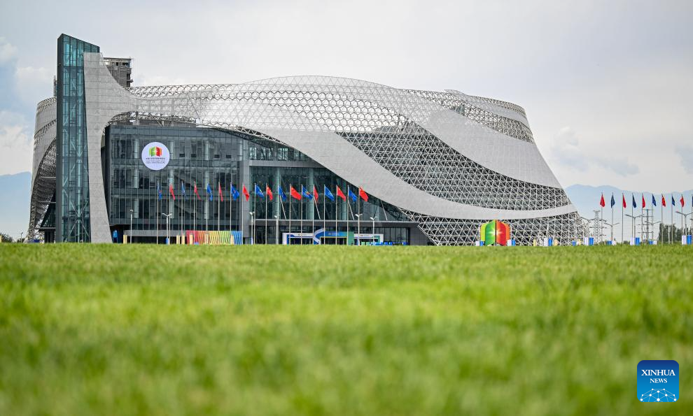 This photo taken on Aug. 28, 2025 shows a view outside the venue of the seventh China-Arab States Expo in Yinchuan, northwest China's Ningxia Hui Autonomous Region. The seventh China-Arab States Expo kicked off on Thursday in Yinchuan, capital of northwest China's Ningxia Hui Autonomous Region, attracting more than 7,600 participants and over 2,200 enterprises and institutions from 75 countries and regions. Themed "Innovation, Green Development and Prosperity," the four-day expo will host trade fairs and forums focused on eight key sectors, including investment, technology transfer and innovation cooperation, modern agriculture, tourism, and intellectual property. The offline exhibition is divided into six sections, showcasing Belt and Road cooperation, regional economic partnerships, central state-owned enterprises, clean energy, the digital economy, and specialty products. (Xinhua/Feng Kaihua)