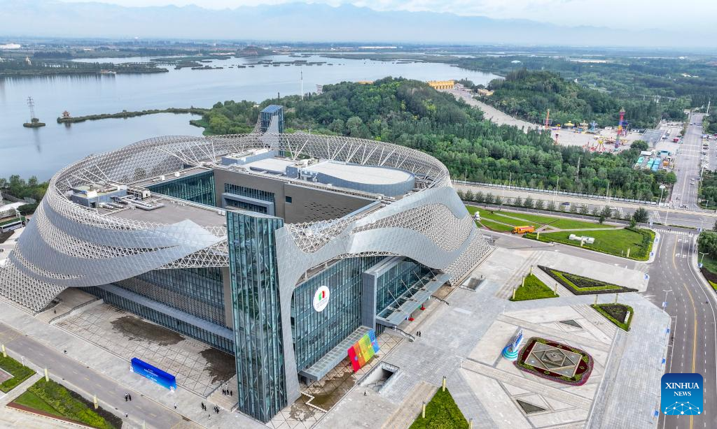 An aerial drone photo taken on Aug. 28, 2025 shows an outside view of the venue of the seventh China-Arab States Expo in Yinchuan, northwest China's Ningxia Hui Autonomous Region. The seventh China-Arab States Expo kicked off on Thursday in Yinchuan, capital of northwest China's Ningxia Hui Autonomous Region, attracting more than 7,600 participants and over 2,200 enterprises and institutions from 75 countries and regions. (Xinhua/Feng Kaihua)