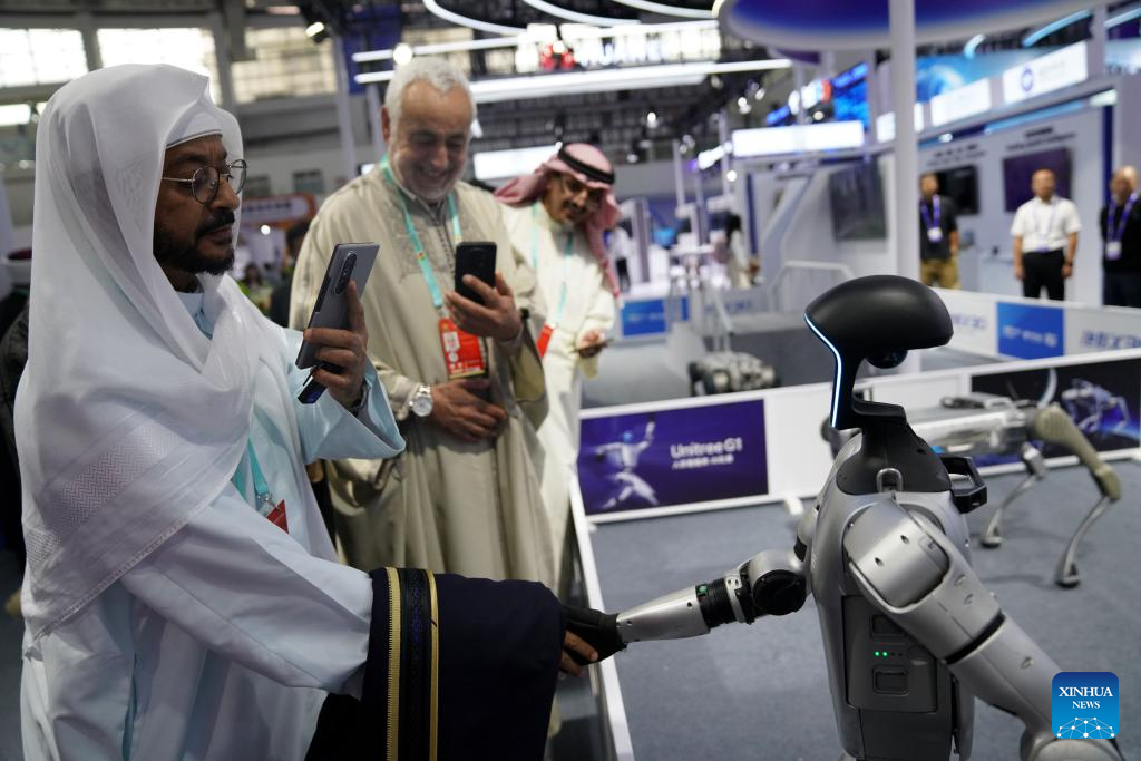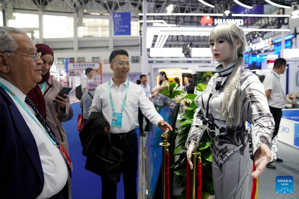 Visitors interact with a humanoid robot at the seventh China-Arab States Expo in Yinchuan, northwest China's Ningxia Hui Autonomous Region, Aug. 28, 2025. The seventh China-Arab States Expo kicked off on Thursday in Yinchuan, capital of northwest China's Ningxia Hui Autonomous Region, attracting more than 7,600 participants and over 2,200 enterprises and institutions from 75 countries and regions. (Xinhua/Zhao Yusi)
