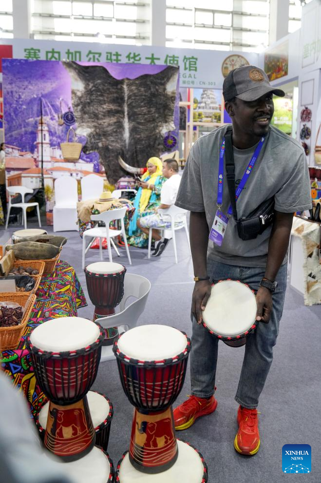 An exhibitor from Senegal performs African drum at the seventh China-Arab States Expo in Yinchuan, northwest China's Ningxia Hui Autonomous Region, Aug. 28, 2025. The seventh China-Arab States Expo kicked off on Thursday in Yinchuan, capital of northwest China's Ningxia Hui Autonomous Region, attracting more than 7,600 participants and over 2,200 enterprises and institutions from 75 countries and regions. (Xinhua/Zhao Yusi)