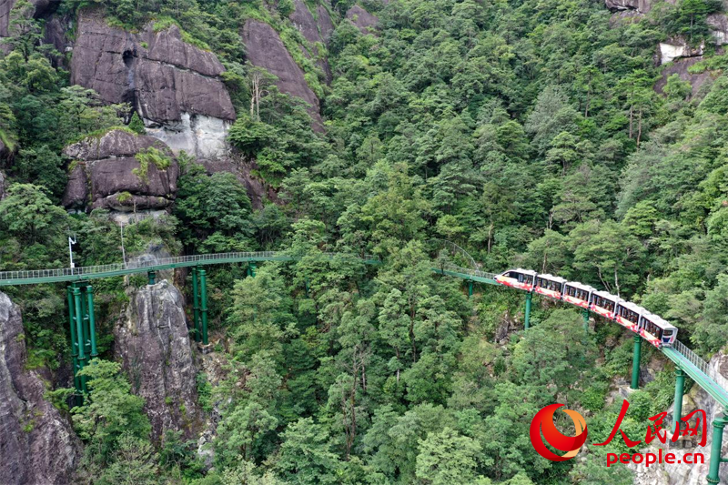 At Dajue Mountain in Zixi county, Fuzhou city, Jiangxi, an electric train glides through the mist. According to Ji Dangru, executive director of the Dajue Mountain scenic area, the train runs 13.14 kilometers with zero emissions and zero pollution.