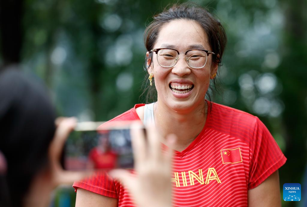 Chinese discus thrower Feng Bin is interviewed by reporters after a training session at Beijing Sport University in Beijing, China, Aug. 29, 2025. (Xinhua/Wang Lili)