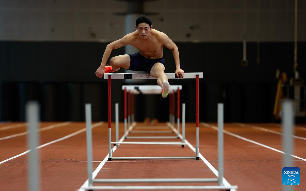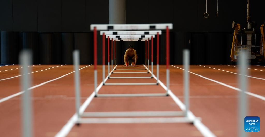 Chinese 110m hurdler Liu Junxi takes a training session at Beijing Sport University in Beijing, China, Aug. 29, 2025. (Xinhua/Wang Lili)
