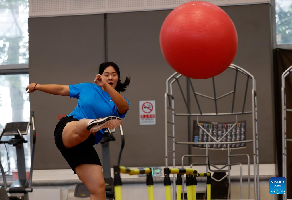 Chinese shot putter Xing Jialiang takes a training session at Beijing Sport University in Beijing, China, Aug. 29, 2025. (Xinhua/Wang Lili)