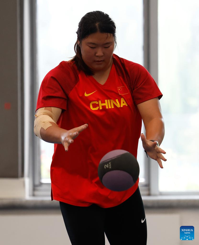Chinese shot putter Sun Yue takes a training session at Beijing Sport University in Beijing, China, Aug. 29, 2025. (Xinhua/Wang Lili)