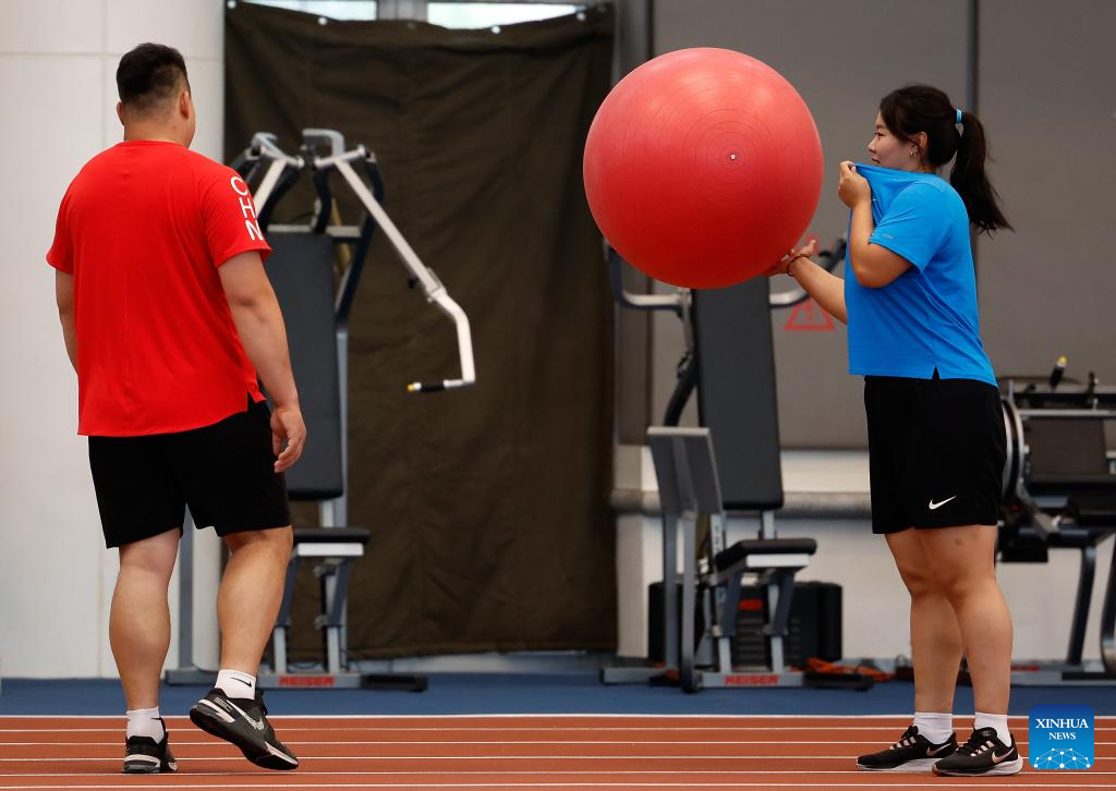 Chinese shot putters Sun Yue (R) and Xing Jialiang take a training session at Beijing Sport University in Beijing, China, Aug. 29, 2025. (Xinhua/Wang Lili)
