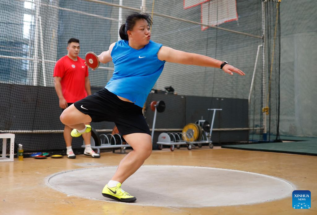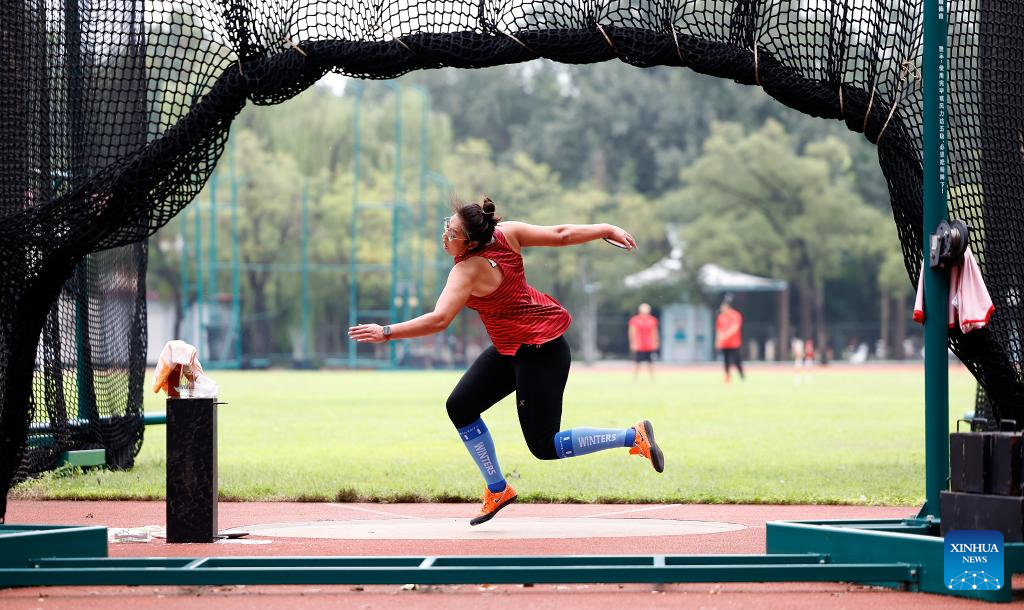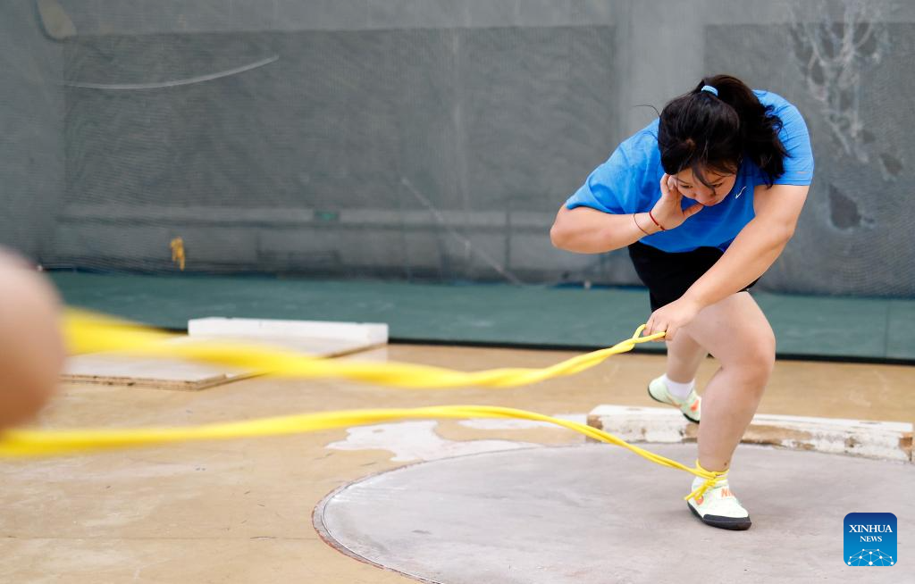 Chinese discus thrower Feng Bin takes a training session at Beijing Sport University in Beijing, China, Aug. 29, 2025. (Xinhua/Wang Lili)