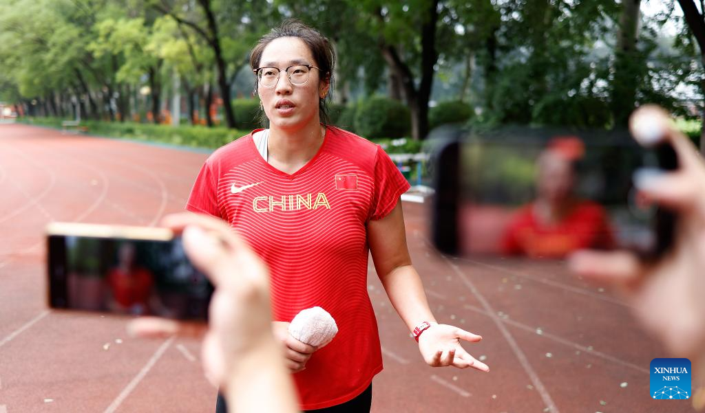 Chinese discus thrower Feng Bin is ininterviewed by reporters after a training session at Beijing Sport University in Beijing, China, Aug. 29, 2025. (Xinhua/Wang Lili)