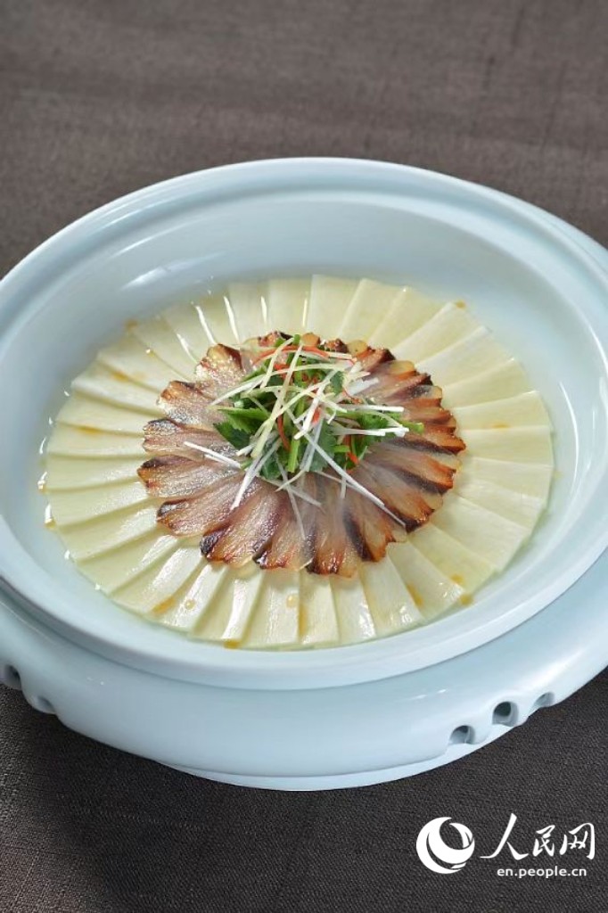 A savory creation highlighting ginseng as the main ingredient, paired with slow-simmered chicken broth and house-made braised pork slices, producing a flavorful yet light taste at a health-nourishing club in Huinan county of Tonghua, northeast China's Jilin Province. (Photo provided to People's Daily Online)