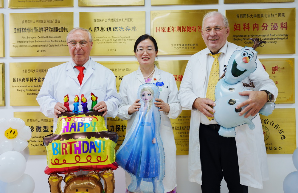 (L to R) Professors Alfred Mueck, Ruan Xiangyan and Thomas Rabe celebrate the second birthday of You You, China's first baby to undergo a cryopreserved ovarian tissue transplant, at the Beijing Obstetrics and Gynecology Hospital, Sept. 6, 2023. [Photo provided by Ruan Xiangyan]