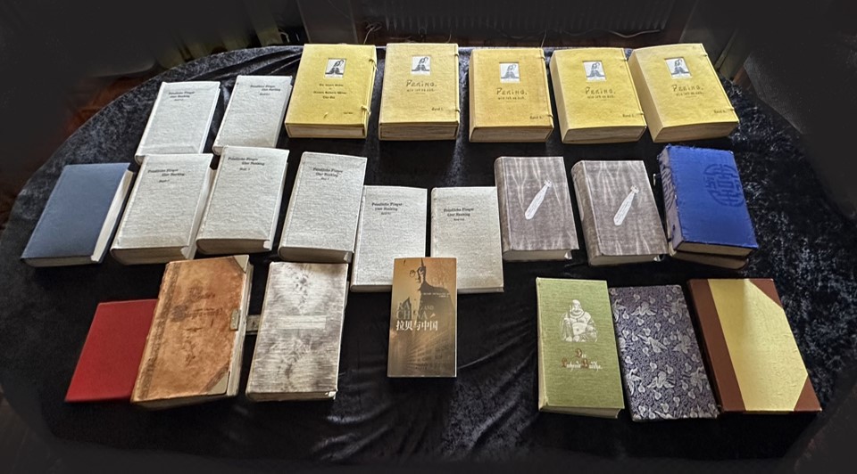 A display featuring John Rabe's published works alongside Thomas Rabe's latest book 'Rabe and China' at the John Rabe Communication Center in Heidelberg. [Photo provided by Thomas Rabe]