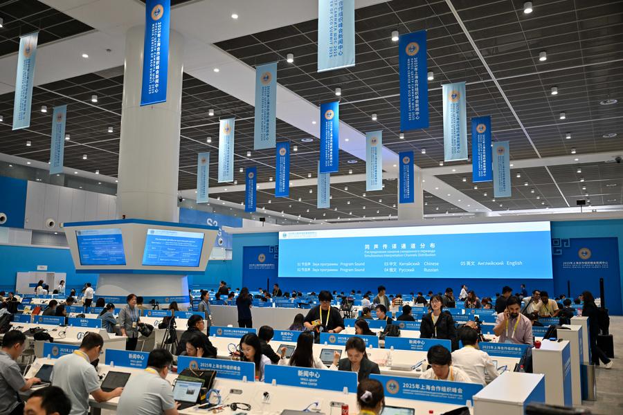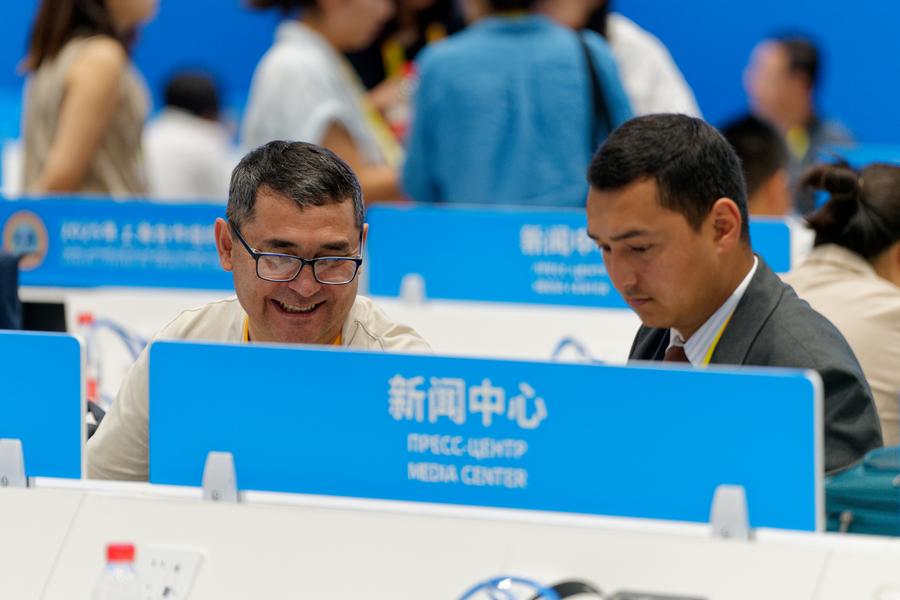 Reporters work at the media center for the Shanghai Cooperation Organization (SCO) Summit 2025 in north China's Tianjin on Aug. 30, 2025. (Xinhua/Sun Fanyue)