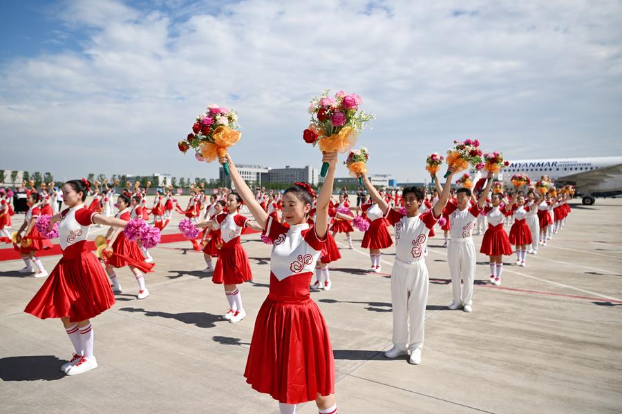 Staff members welcome guests at the Tianjin Binhai International Airport in north China's Tianjin, Aug. 30, 2025. (Xinhua/Hao Yuan)