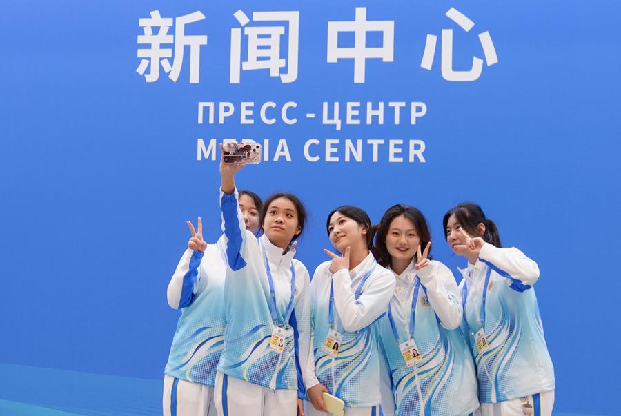 Volunteers pose for a selfie at the media center for the Shanghai Cooperation Organization (SCO) Summit 2025 in north China's Tianjin on Aug. 30, 2025. (Xinhua/Dai Mingxuan)