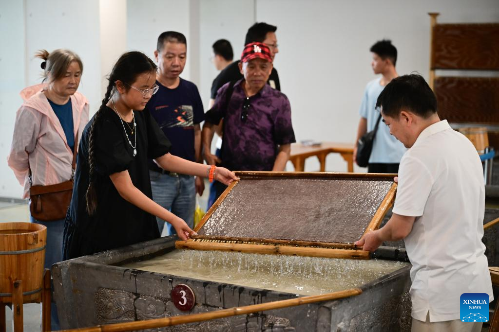 Visitors learns about the Xuan paper making technique at the Xuan paper cultural park in Jingxian County, east China's Anhui Province, July 15, 2025. The summer cultural tourism market is thriving in Anhui Province, with the intangible cultural heritages becoming a major draw for visitors. Various activities provide diverse travel experiences for tourists, vitalizing the tourism sector of the province continuously. (Xinhua/Zhou Mu)