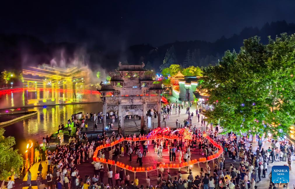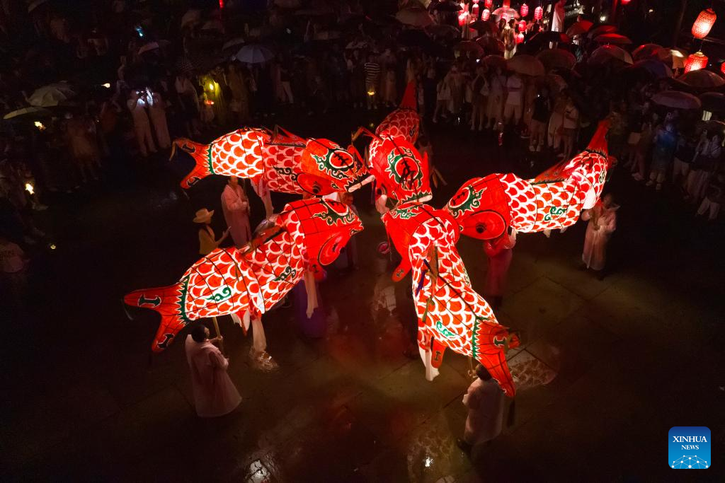 Tourists watch a parade of the fish-shaped lanterns in Xiuning County of Huangshan City, east China's Anhui Province, Aug. 27, 2025. The summer cultural tourism market is thriving in Anhui Province, with the intangible cultural heritages becoming a major draw for visitors. Various activities provide diverse travel experiences for tourists, vitalizing the tourism sector of the province continuously. (Xinhua/Zhou Mu)