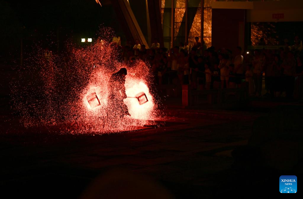 A performance of the molten iron fireworks is staged in Xiuning County of Huangshan City, east China's Anhui Province, Aug. 27, 2025. The summer cultural tourism market is thriving in Anhui Province, with the intangible cultural heritages becoming a major draw for visitors. Various activities provide diverse travel experiences for tourists, vitalizing the tourism sector of the province continuously. (Xinhua/Zhou Mu)