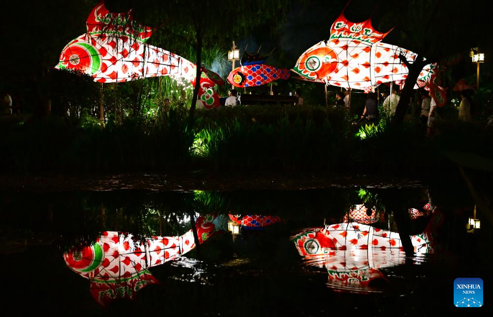 Tourists watch the fish-shaped lanterns in Chengkan Village, Huizhou District, Huangshan City of east China's Anhui Province, Aug. 21, 2025. The summer cultural tourism market is thriving in Anhui Province, with the intangible cultural heritages becoming a major draw for visitors. Various activities provide diverse travel experiences for tourists, vitalizing the tourism sector of the province continuously. (Xinhua/Zhou Mu)