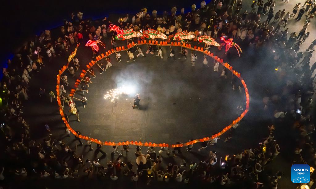 An aerial drone photo shows the molten iron fireworks show and Huohu (fire pot) performance in Xiuning County of Huangshan City, east China's Anhui Province, Aug. 27, 2025. The summer cultural tourism market is thriving in Anhui Province, with the intangible cultural heritages becoming a major draw for visitors. Various activities provide diverse travel experiences for tourists, vitalizing the tourism sector of the province continuously. (Xinhua/Zhou Mu)