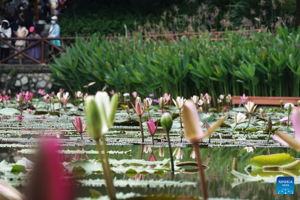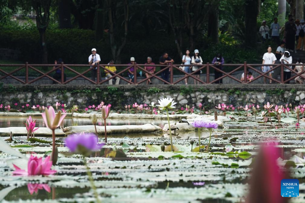 Visitors view water lilies at Renmin park in Nanning, south China's Guangxi Zhuang Autonomous Region, Aug. 31, 2025. More than 900 water lilies cultivated at Renmin park have begun to bloom in early autumn. (Photo by Yu Xiangquan/Xinhua)