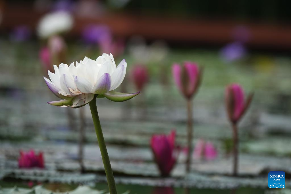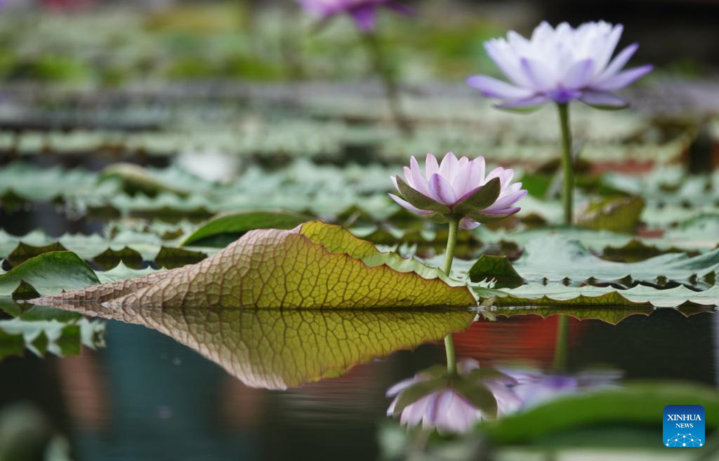 This photo taken on Aug. 31, 2025 shows water lilies at Renmin park in Nanning, south China's Guangxi Zhuang Autonomous Region. More than 900 water lilies cultivated at Renmin park have begun to bloom in early autumn. (Photo by Yu Xiangquan/Xinhua)
