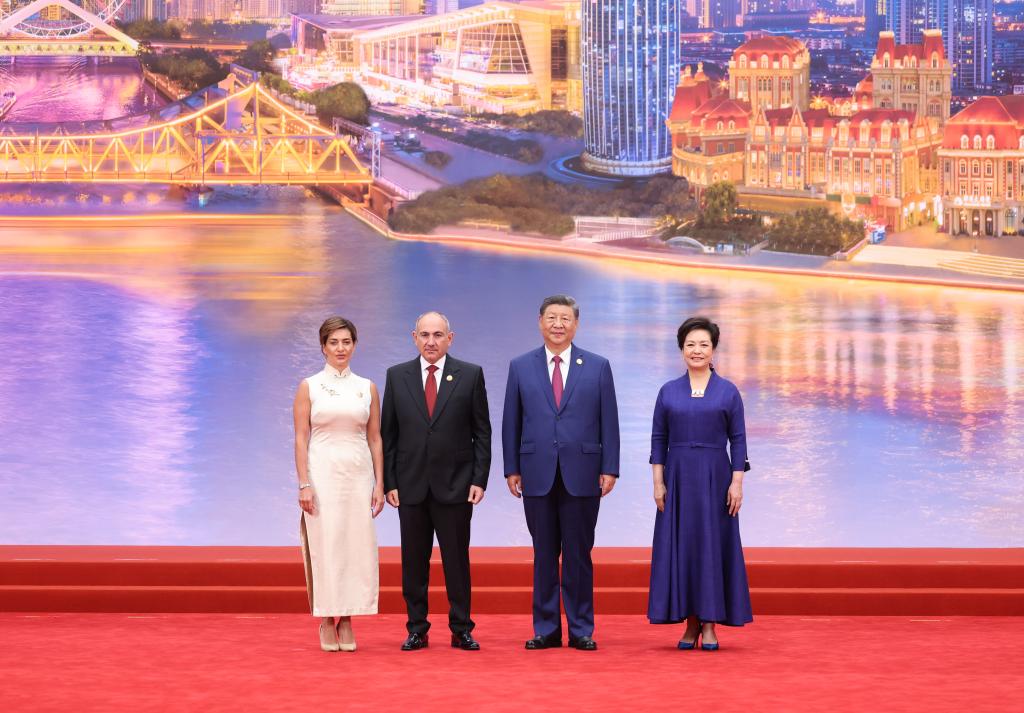 Chinese President Xi Jinping and his wife, Peng Liyuan, pose for a group photo with Armenian Prime Minister Nikol Pashinyan and his wife at the Meijiang Convention and Exhibition Center in Tianjin, north China, Aug. 31, 2025. Xi and Peng on Sunday hosted a banquet in China's port city of Tianjin to welcome international guests who are here to attend the Shanghai Cooperation Organization (SCO) Summit 2025. (Xinhua/Ding Haitao)