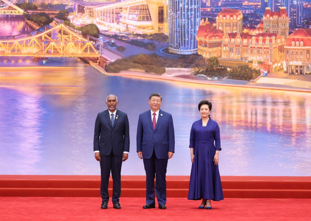 Chinese President Xi Jinping and his wife, Peng Liyuan, pose for a group photo with Maldivian President Mohamed Muizzu at the Meijiang Convention and Exhibition Center in Tianjin, north China, Aug. 31, 2025. Xi and Peng on Sunday hosted a banquet in China's port city of Tianjin to welcome international guests who are here to attend the Shanghai Cooperation Organization (SCO) Summit 2025. (Xinhua/Huang Jingwen)