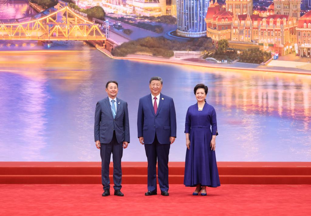 Chinese President Xi Jinping and his wife, Peng Liyuan, pose for a group photo with Mongolian President Ukhnaa Khurelsukh and his wife at the Meijiang Convention and Exhibition Center in Tianjin, north China, Aug. 31, 2025. Xi and Peng on Sunday hosted a banquet in China's port city of Tianjin to welcome international guests who are here to attend the Shanghai Cooperation Organization (SCO) Summit 2025. (Xinhua/Huang Jingwen)