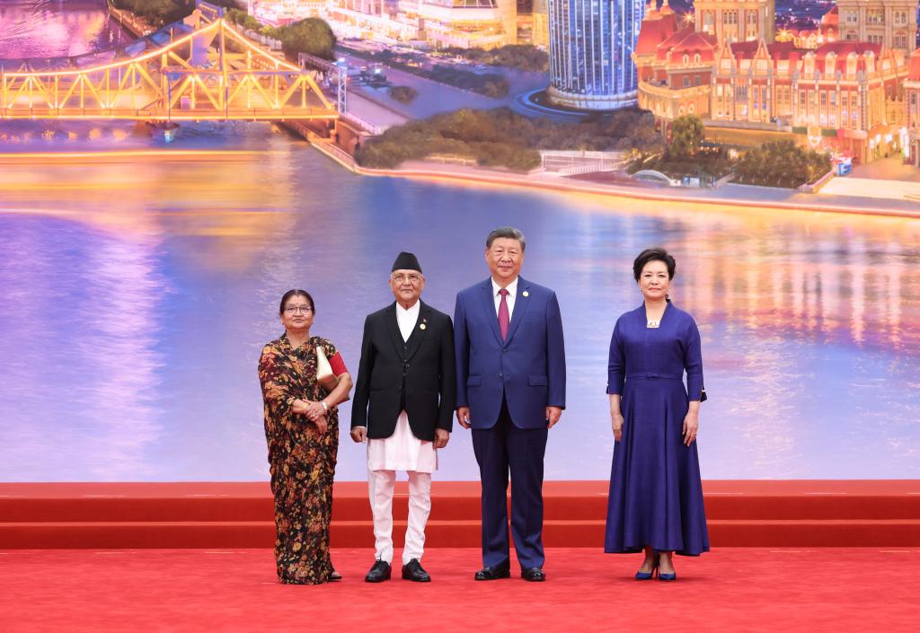 Chinese President Xi Jinping and his wife, Peng Liyuan, pose for a group photo with Nepali Prime Minister KP Sharma Oli and his wife at the Meijiang Convention and Exhibition Center in Tianjin, north China, Aug. 31, 2025. Xi and Peng on Sunday hosted a banquet in China's port city of Tianjin to welcome international guests who are here to attend the Shanghai Cooperation Organization (SCO) Summit 2025. (Xinhua/Huang Jingwen)
